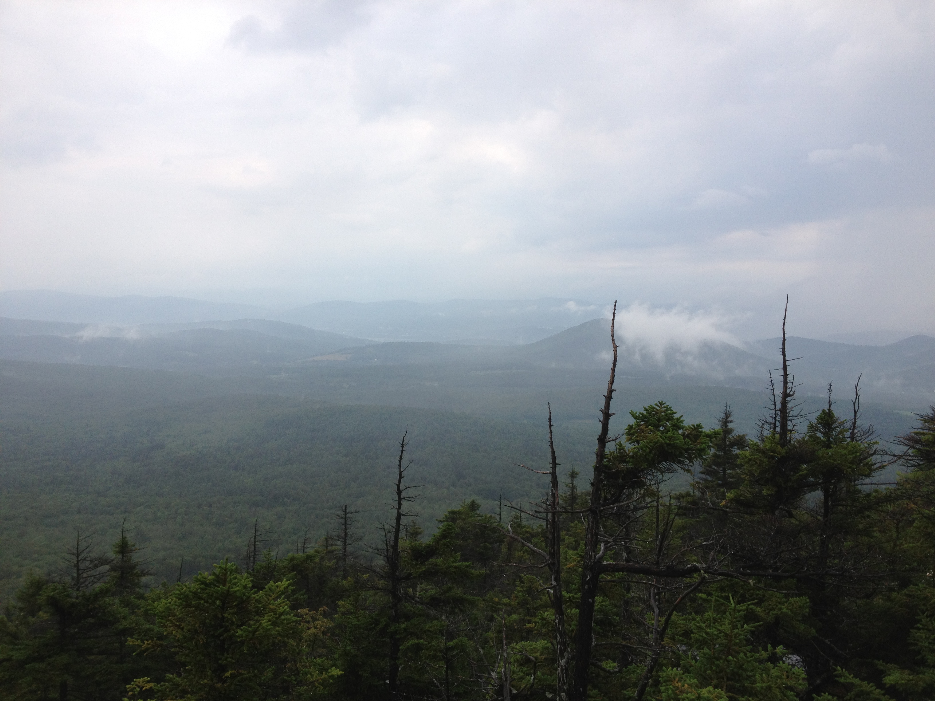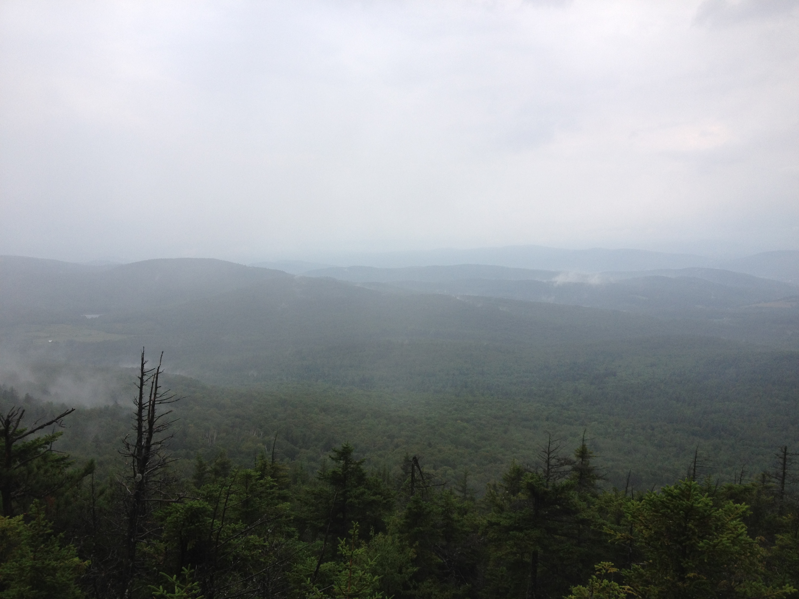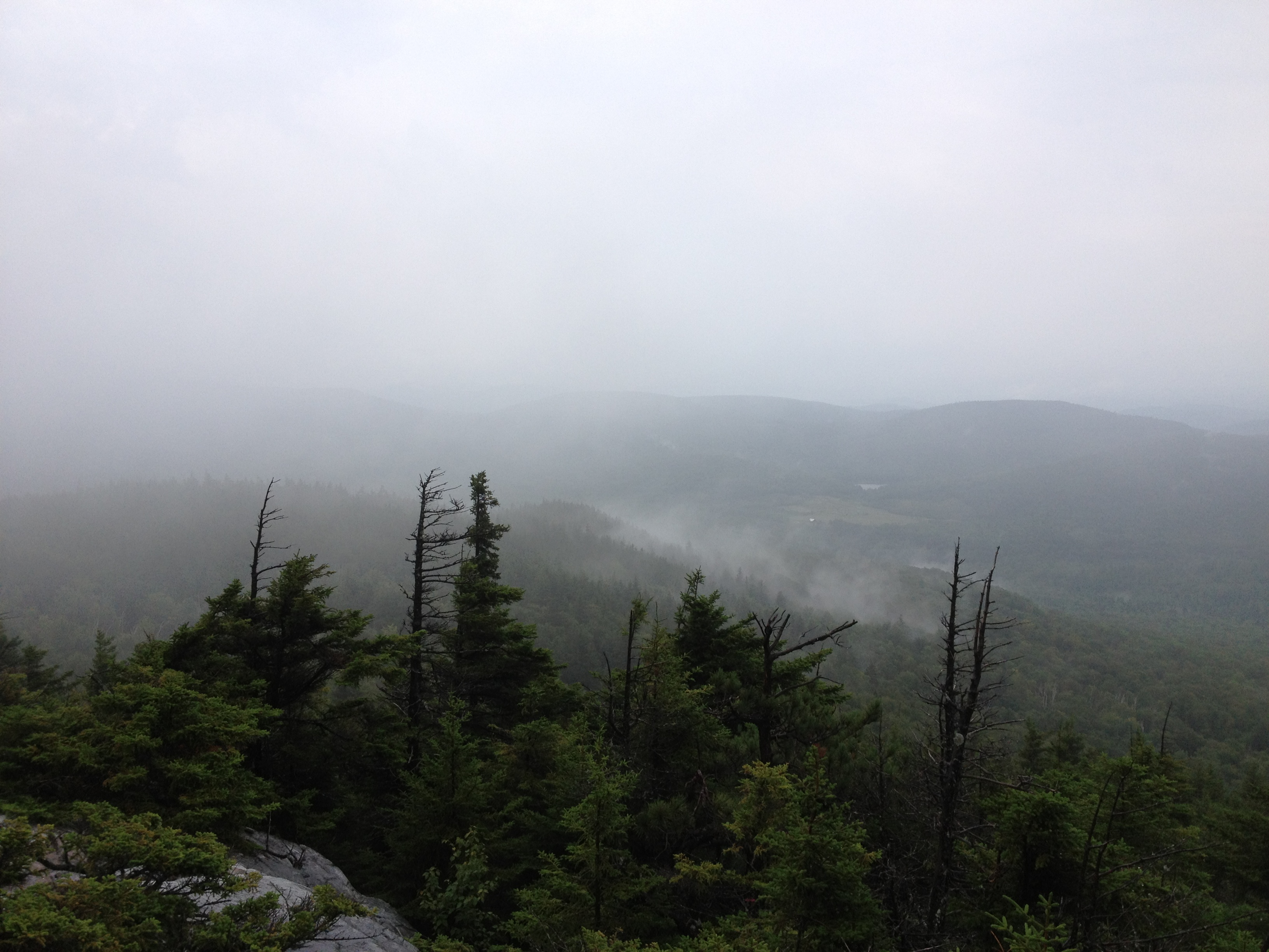 The means: searching for yellow blazes, bush whacking through Spruce Fir and climbing slippery ledge in the pouring rain (the line went straight up and put the team near the summit)
