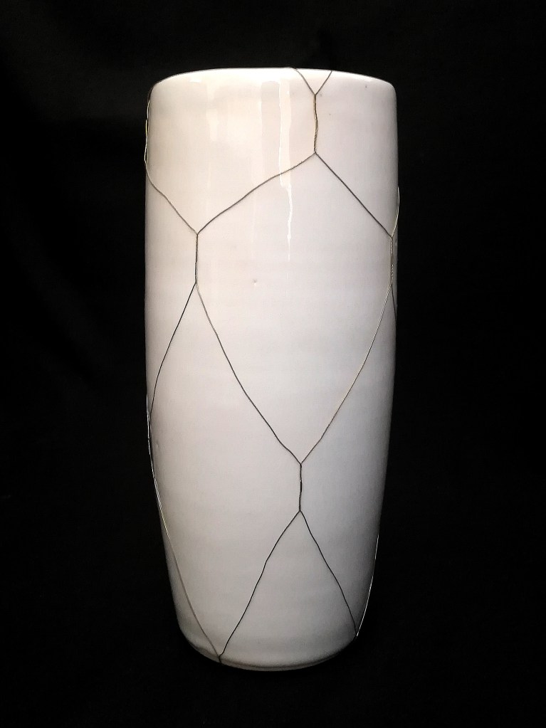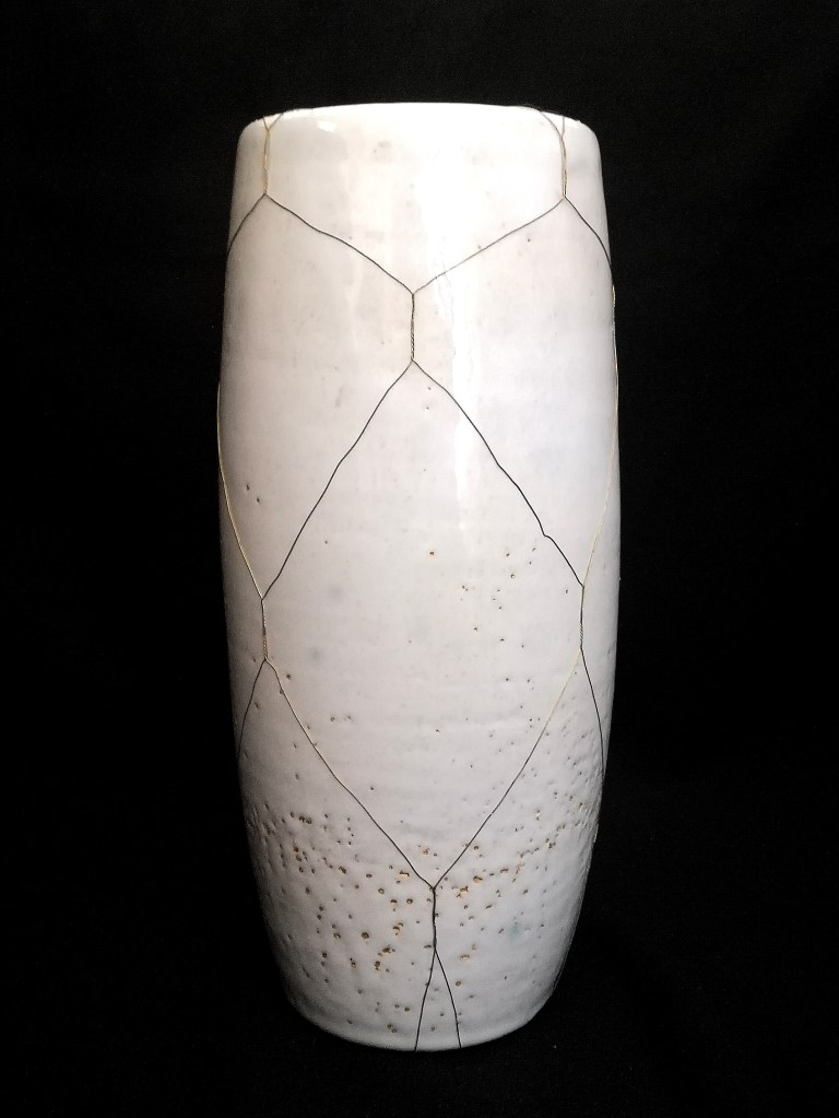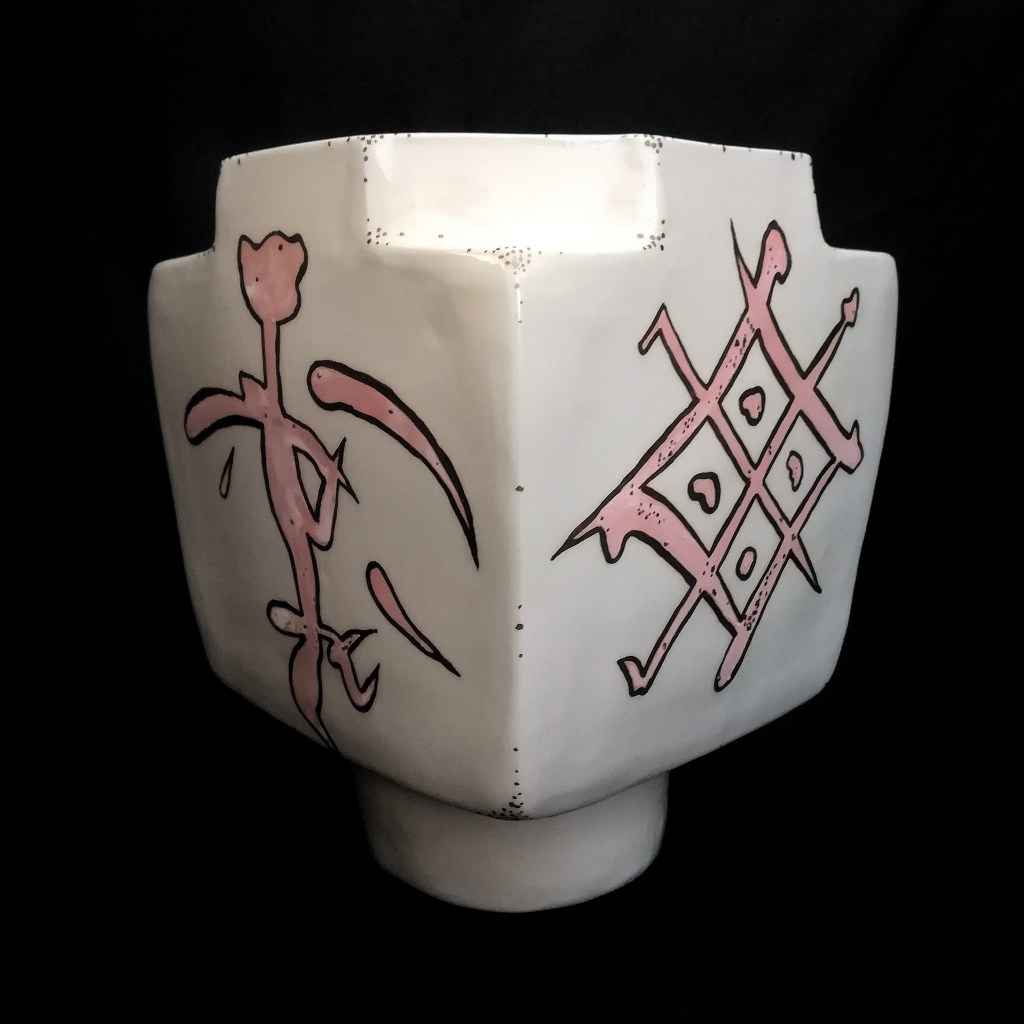 This piece is comprised of 15 slabs rolled out on my table in my first flat in Chamberí. After it was bisque-fired, I dipped it into a white glaze, then handpainted Hamada Shoji’s two most famous images, the broken sugarcane and the rice field. The jar shape is based upon pickling and storage jars that he made. I used this triad of colors to speak to modern Japan’s love and constant association with Hello Kitty.