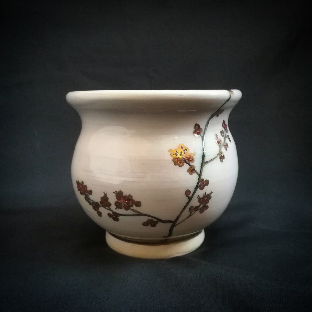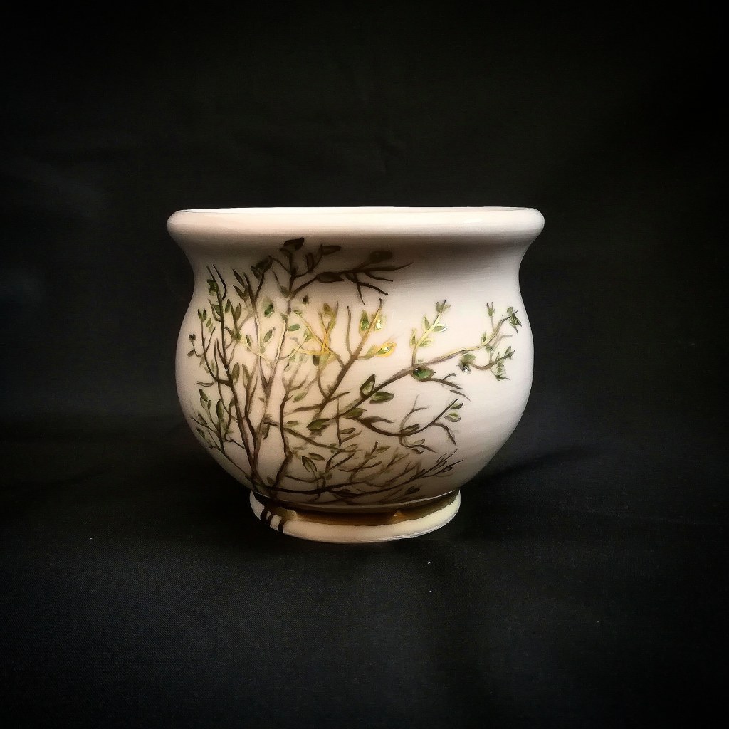 Being among trees, going on hikes to remote locations helped me to discover myself and be the person I am today. This teabowl has a tree with many branches reaching out and upwards. Society tries to fit us into one convenient idea, neatly labelled, and simply represented, but each of us are so much more than what we do and all the little boxes we put ourselves into. We are made up of our life experiences and the lessons we learn. They begin in the womb, and we eventually discover that who we choose to be is not just our own decision, but that of our forefathers/society/culture, and some things must be unlearned to re-acquaint us with our true selves. Having courage to examine and deconstruct those learned behaviors is the key; Knowing, accepting, embracing and reconstructing thyself is walking through that unlocked door.