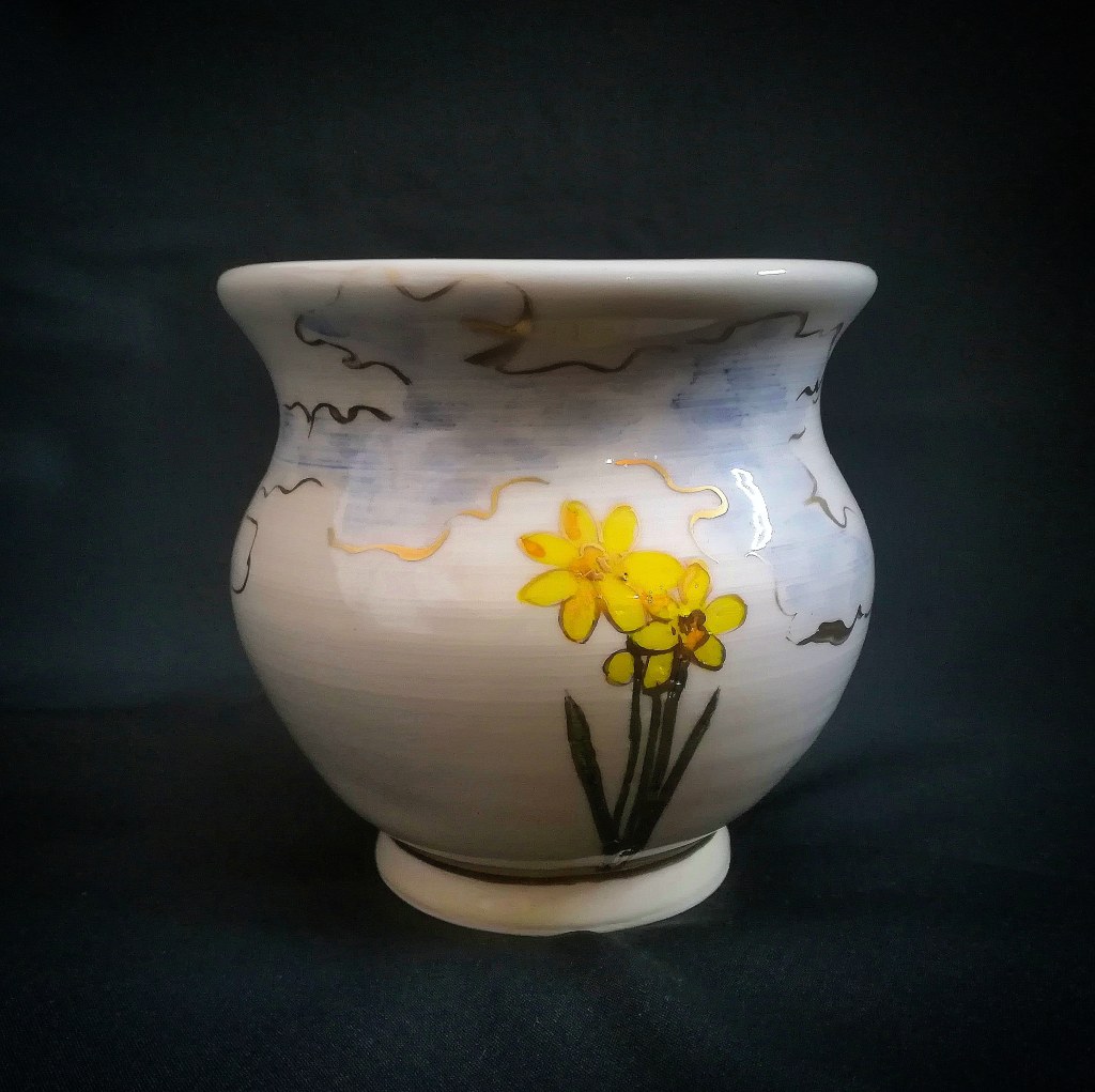 The daffodil is a very interesting flower with lots of deeper meanings. It signals the coming of Spring and symbolizes the idea of rebirth. Not only can it represent the idea of a fresh new start, but it also symbolizes trust, forgiveness, radiance, energy, friendship, and honesty, as well as inner reflection and inspiration. This particular teabowl is very special to me for all the aforementioned, and it is one of the only two in the series in which clouds and sky have been added.