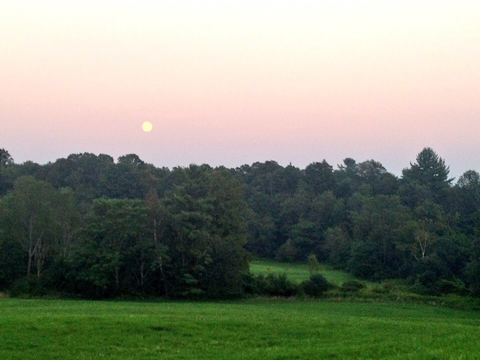 Out in my evening run on Hopson, by way of Elm Street, the trees lining the road suddenly disappear and the sky opens up. I stop and stare. My breath and pulse quickened from the run and sweat trickling down my neck. A blue moon dominates the rose pink sky, large and luminous, and my heart soars.