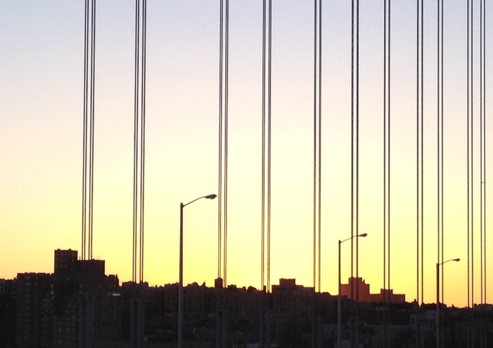 NYC from the GWB An early AM view of the city from a mid-bridge vantage point. No color corrections, slightly cropped on the bottom to remove a passing car that came into frame, and shot with the iPhone 4S. 40.818108 -73.945426